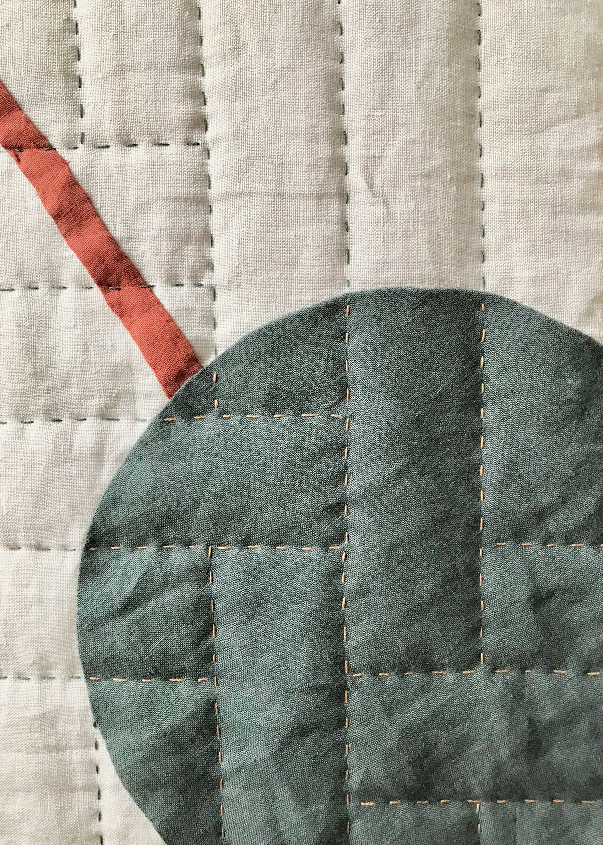 Wallquilt, stitched and quilted by hand. Pure linen, front and reverse, recycled wadding and linen mitred binding. Hanging system on back.