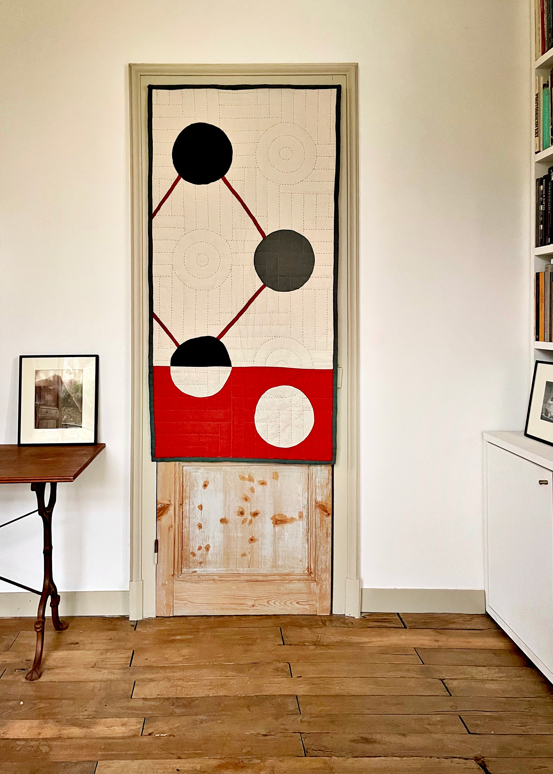 Courtepointe murale, entièrement cousue à la main. Recto et verso en lin, ouate recyclée et bordure lin. Système d’accrochage à l’arrière.