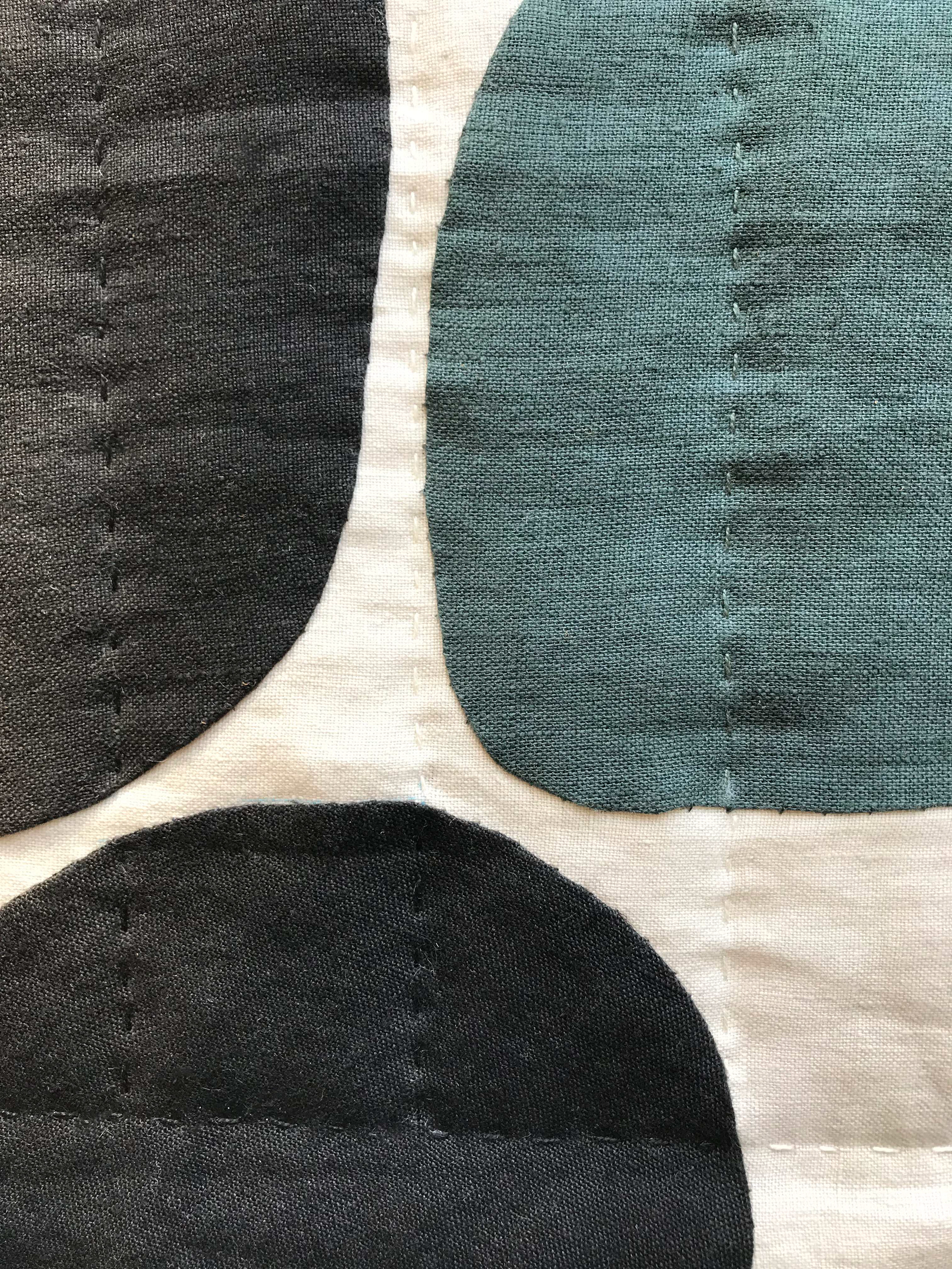 Wallquilt, stitched and quilted by hand. Pure linen, front and reverse, recycled wadding and linen mitred binding. Hanging system on back.