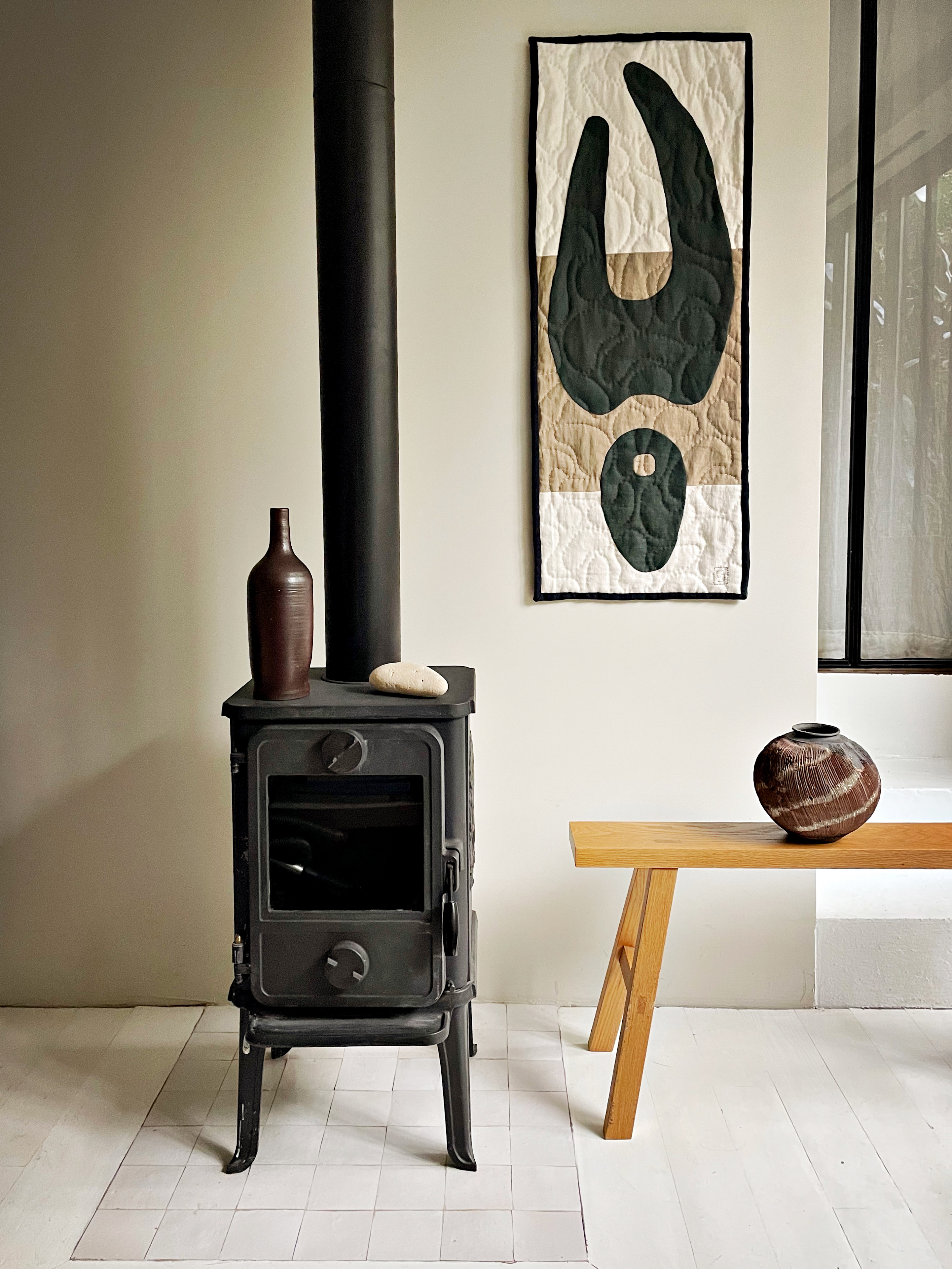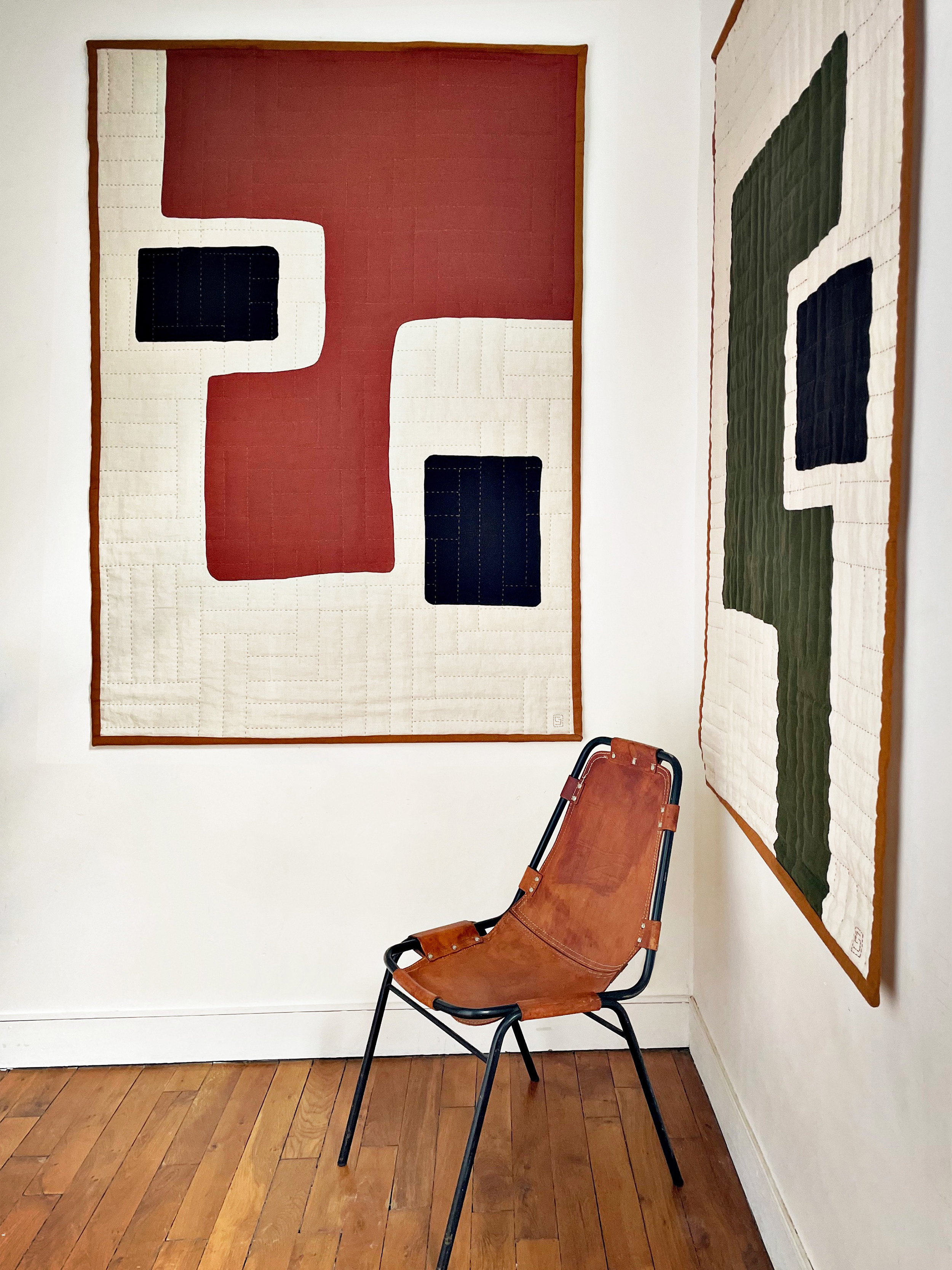 Courtepointe murale, entièrement cousue à la main. Recto et verso en lin, ouate recyclée et bordure lin. Système d’accrochage à l’arrière.