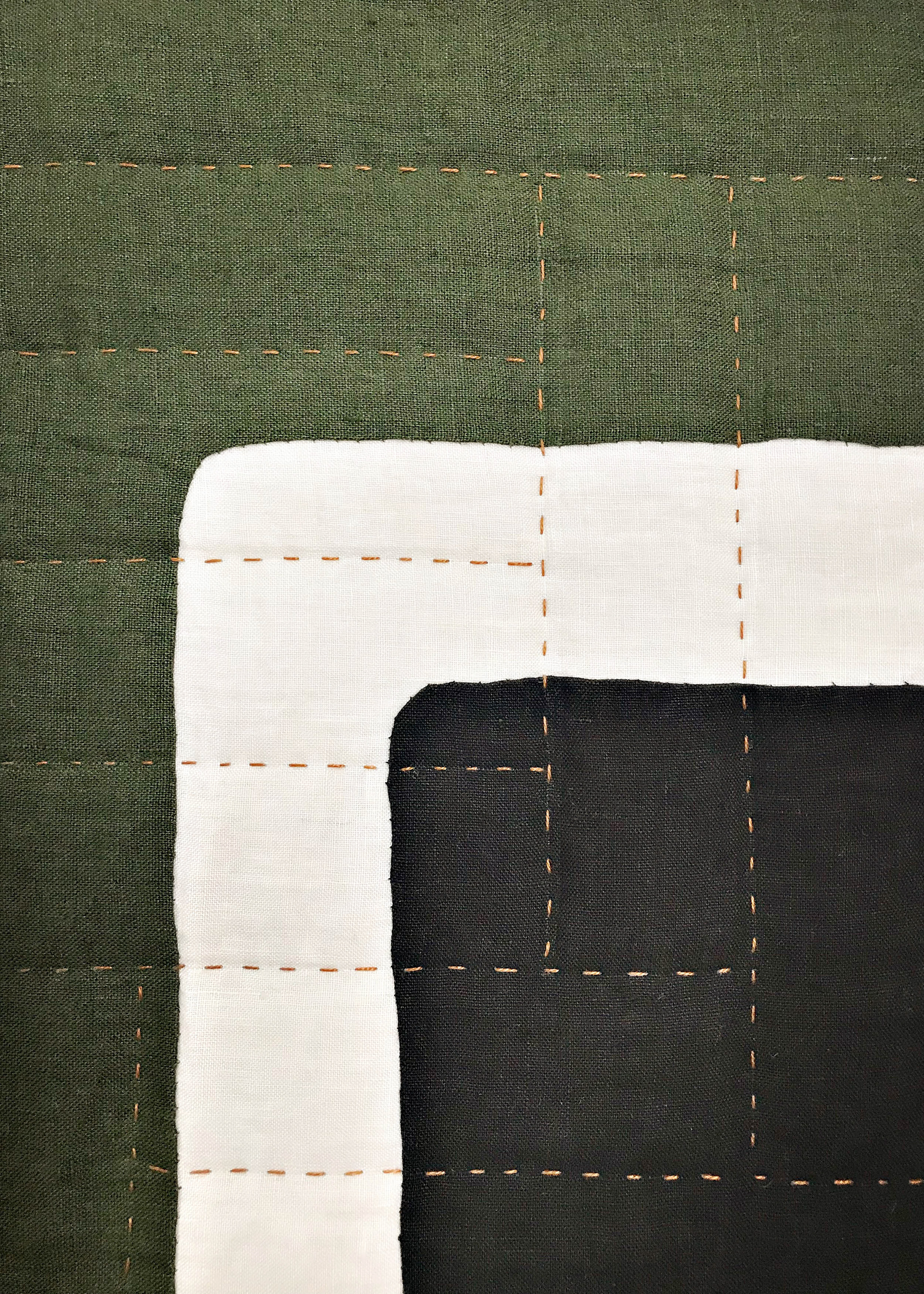 Courtepointe murale, entièrement cousue à la main. Recto et verso en lin, ouate recyclée et bordure lin. Système d’accrochage à l’arrière.