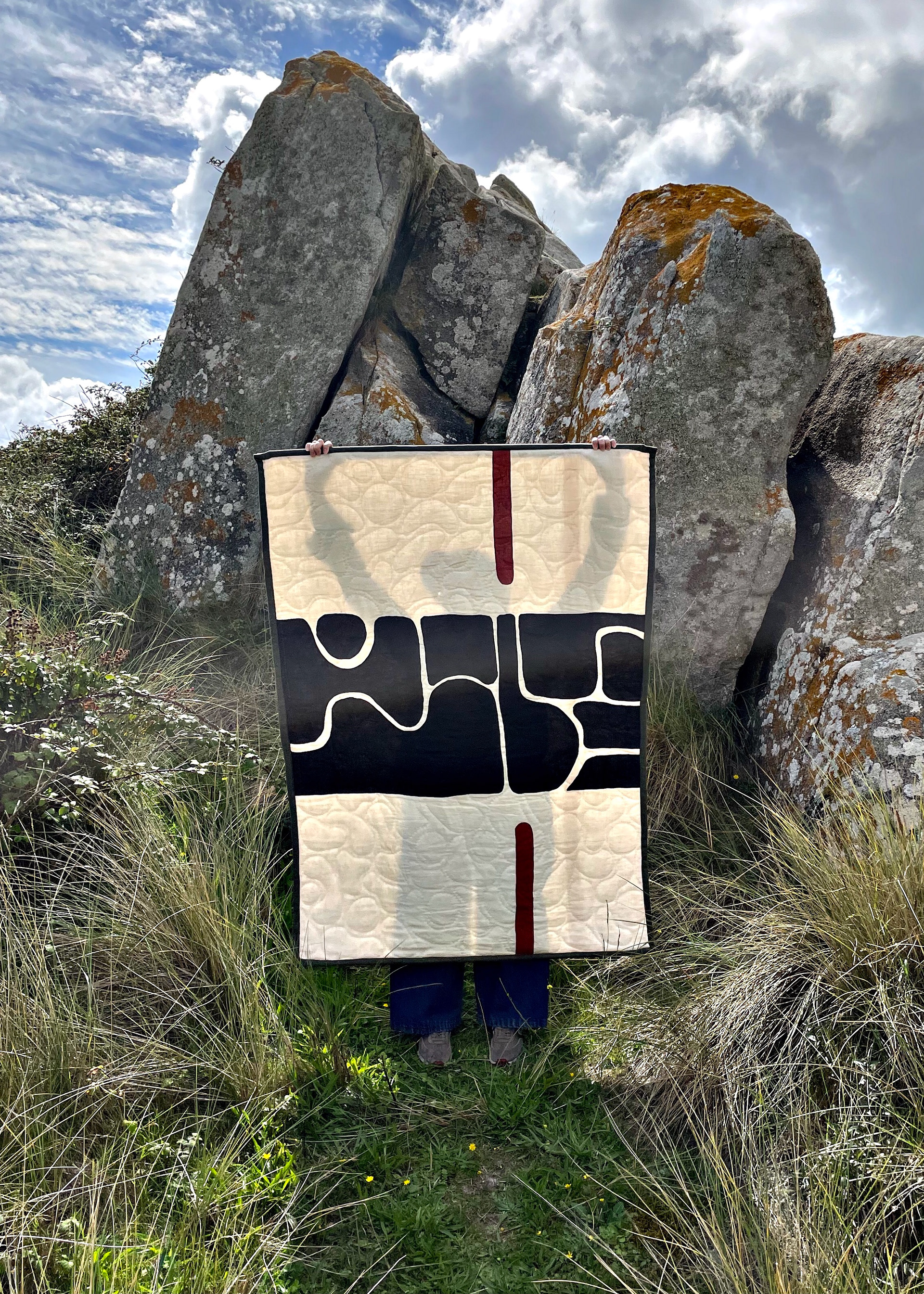 Courtepointe murale, entièrement cousue à la main. Recto et verso en lin, ouate recyclée et bordure lin. Système d’accrochage à l’arrière.
