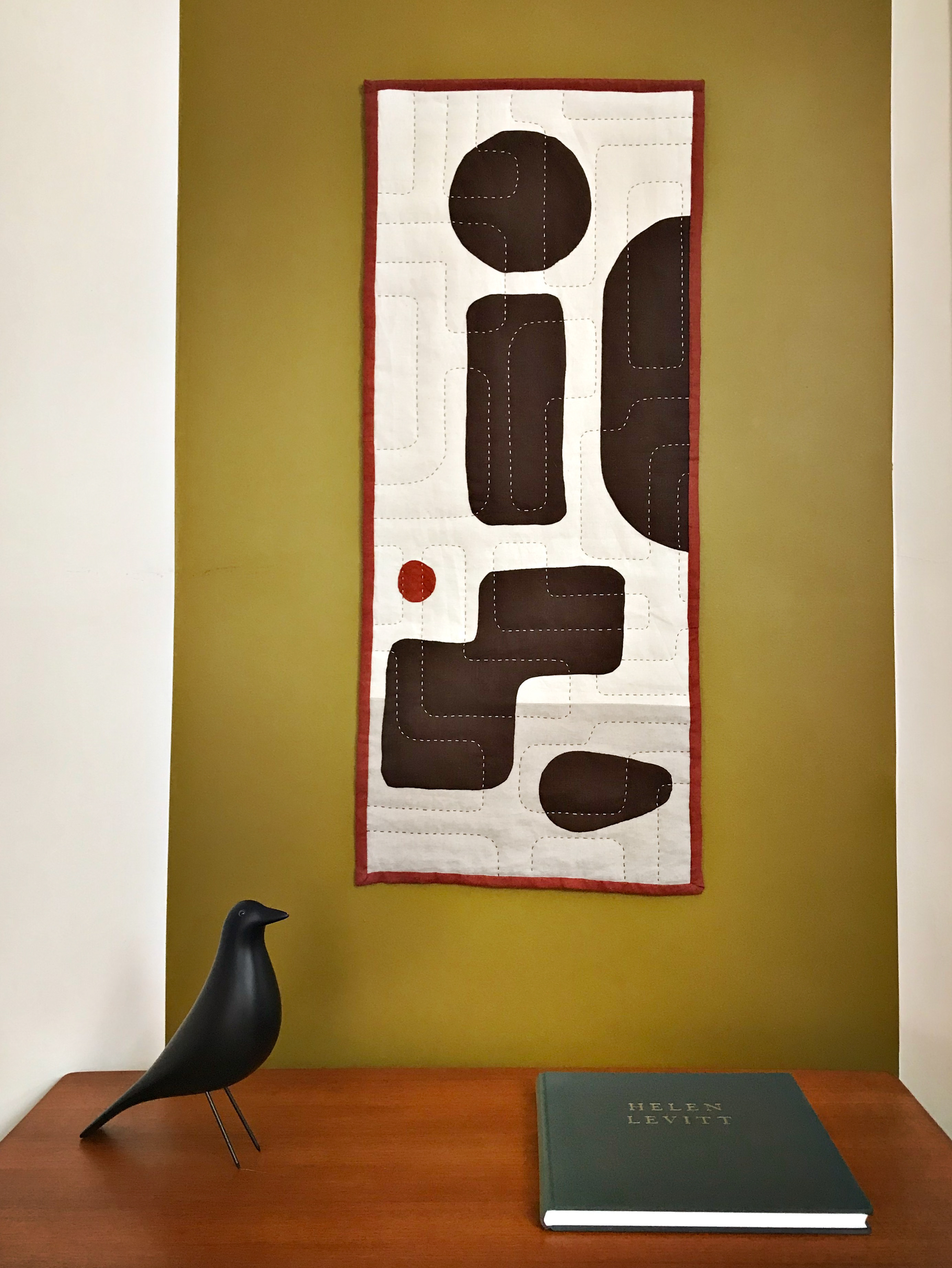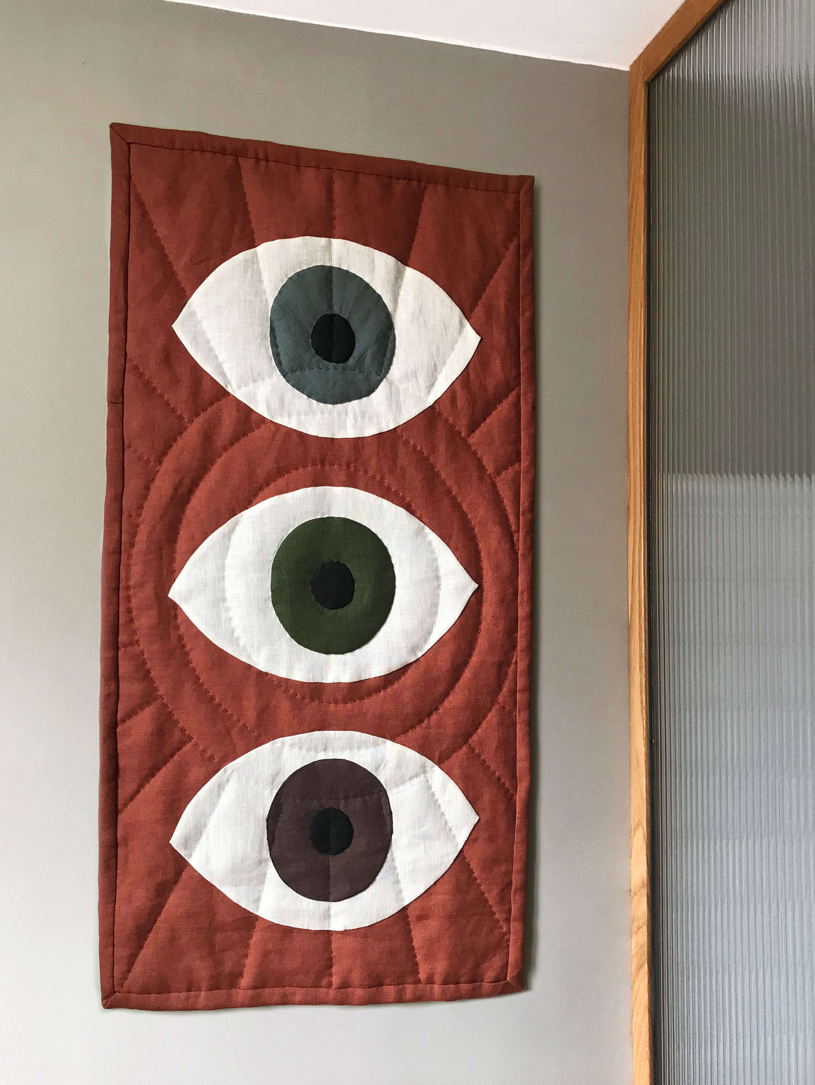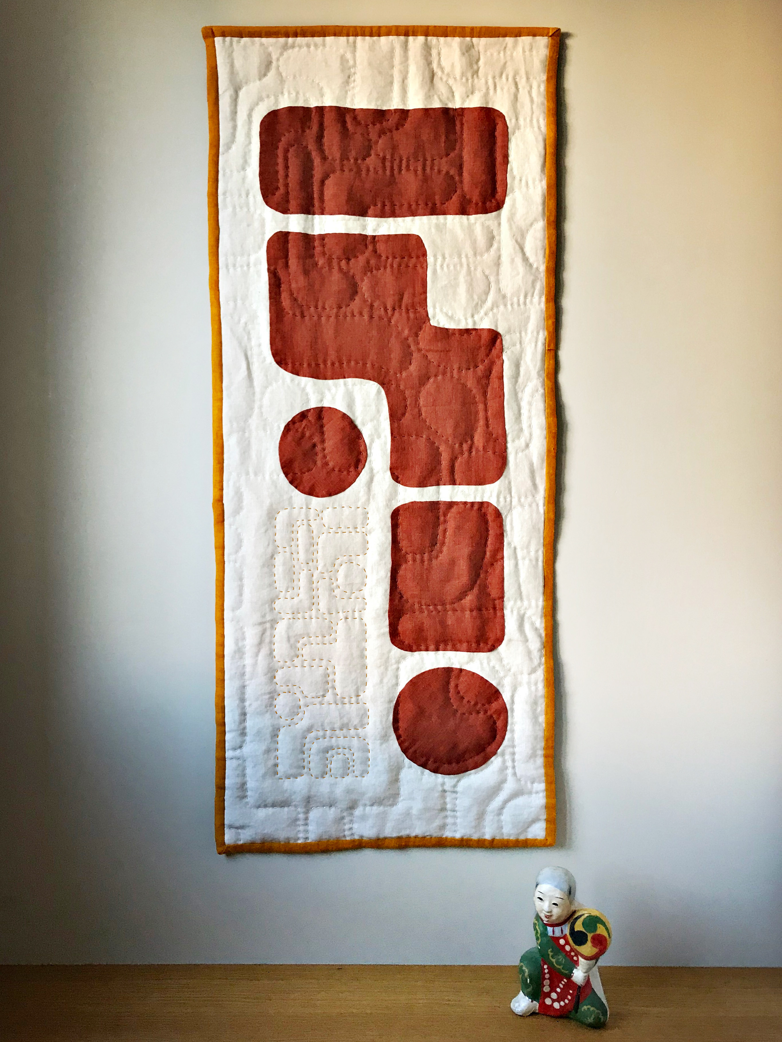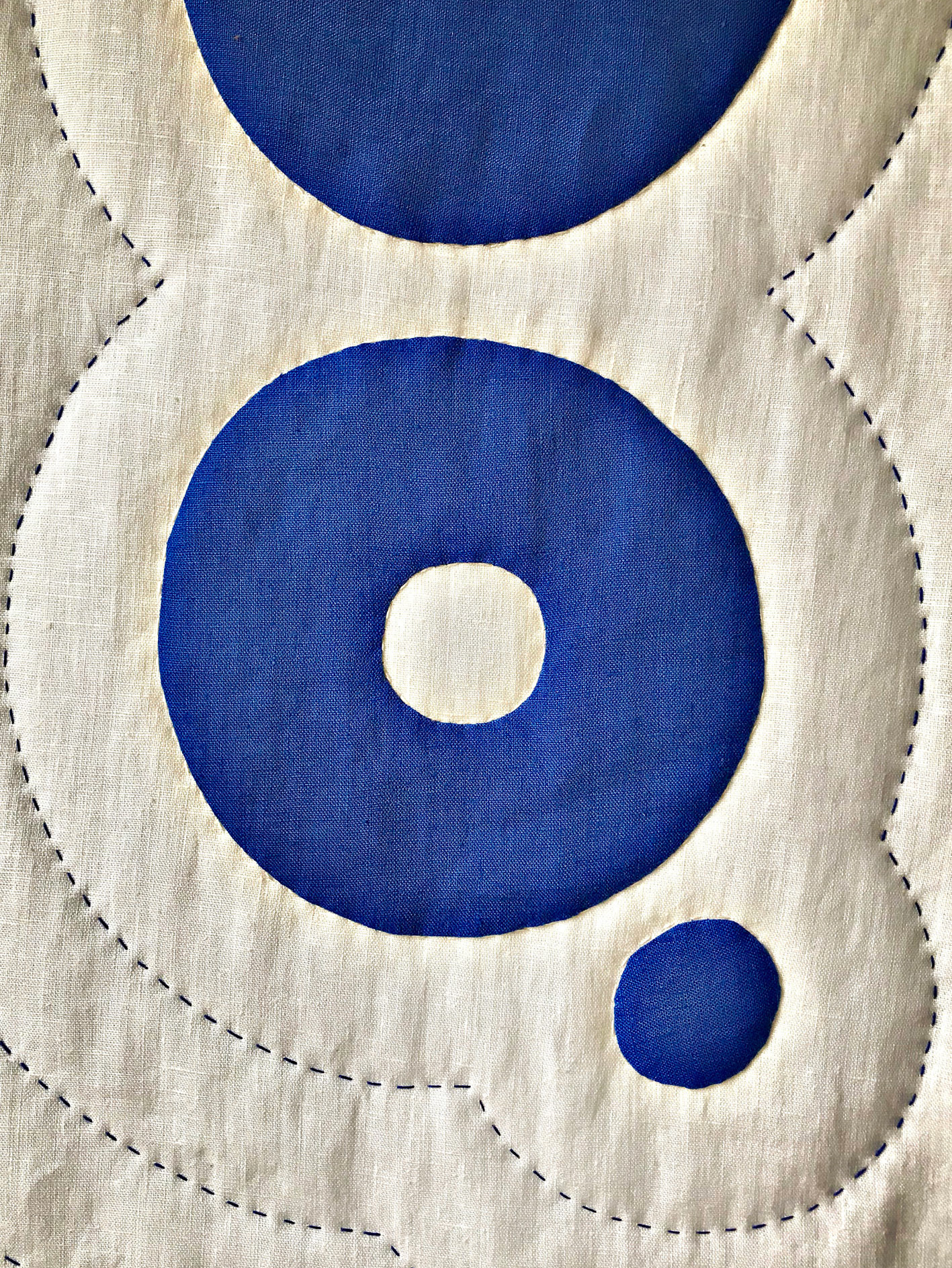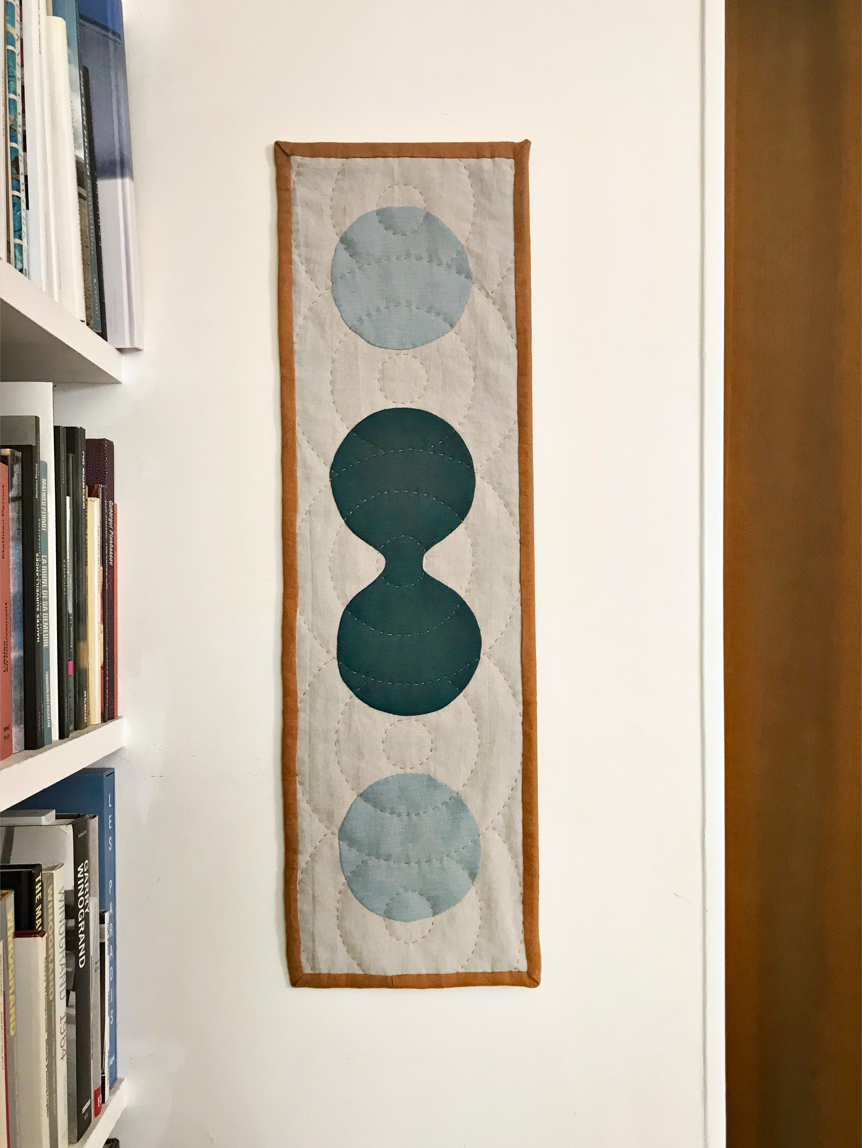 Wallquilt, stitched and quilted by hand. Pure linen, front and reverse, recycled wadding and linen mitred binding. Hanging system on back.