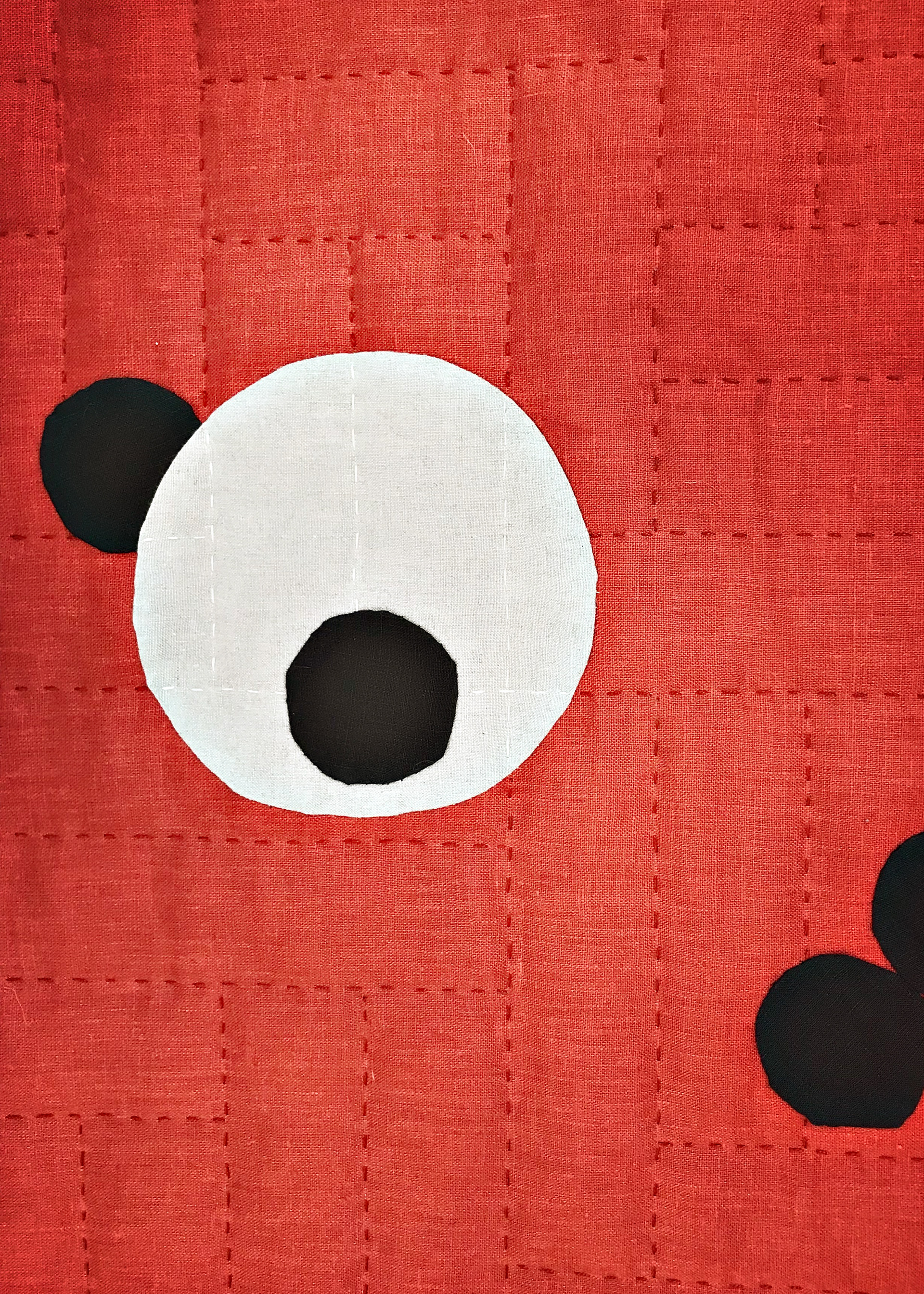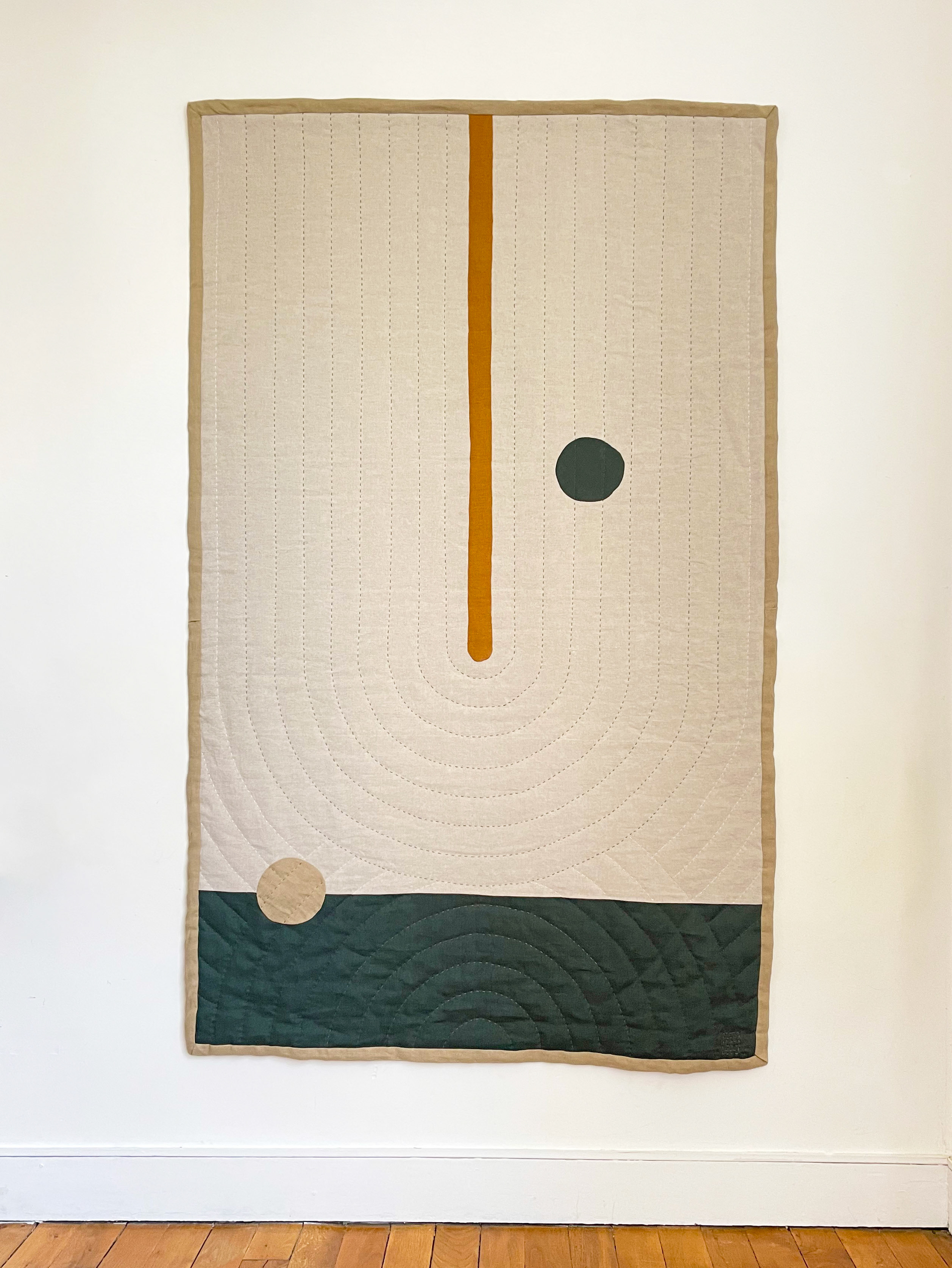 Courtepointe murale, entièrement cousue à la main. Recto et verso en lin, ouate recyclée et bordure lin. Système d’accrochage à l’arrière.