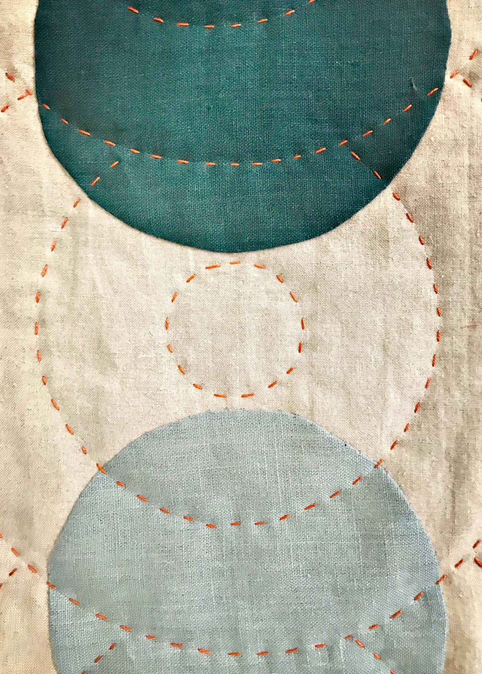 Wallquilt, stitched and quilted by hand. Pure linen, front and reverse, recycled wadding and linen mitred binding. Hanging system on back.